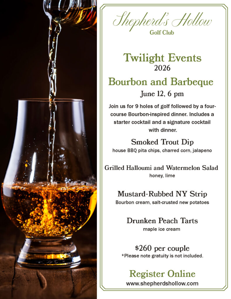 Join us for 9 holes of golf followed by a four-course Bourbon-inspired dinner. Includes a starter cocktail and a signature cocktail with dinner.