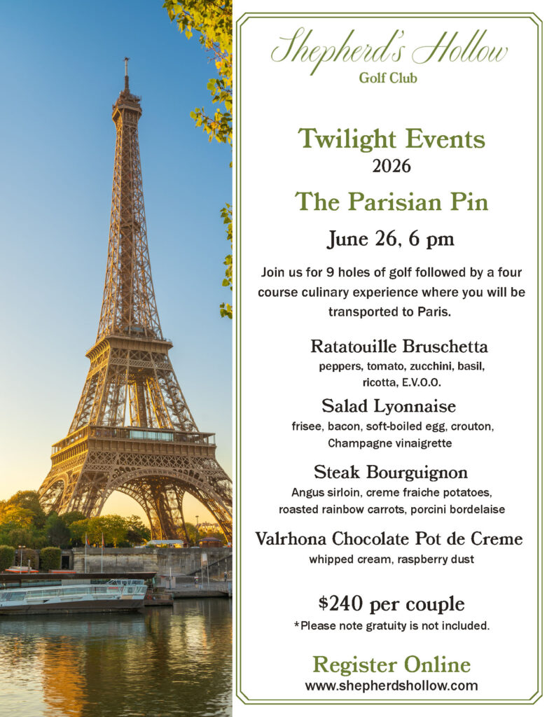 Join us for 9 holes of golf followed by a four course culinary experience where you will be transported to Paris.