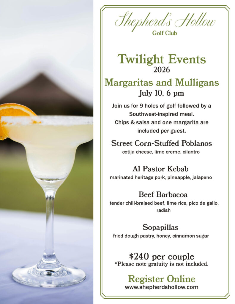 Join us for 9 holes of golf followed by a Southwest-inspired meal. Chips & salsa and one margarita are included per guest.