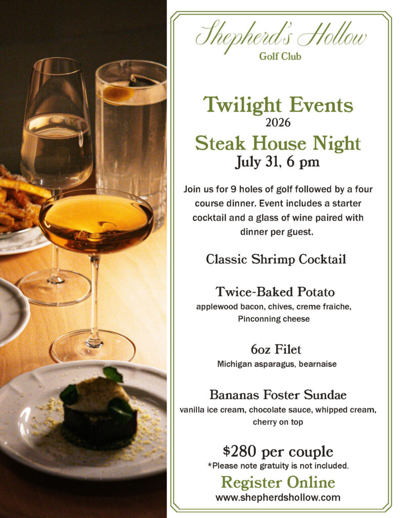 Join us for 9 holes of golf followed by a four-course dinner. The event includes a starter cocktail and a glass of wine paired with dinner per guest.