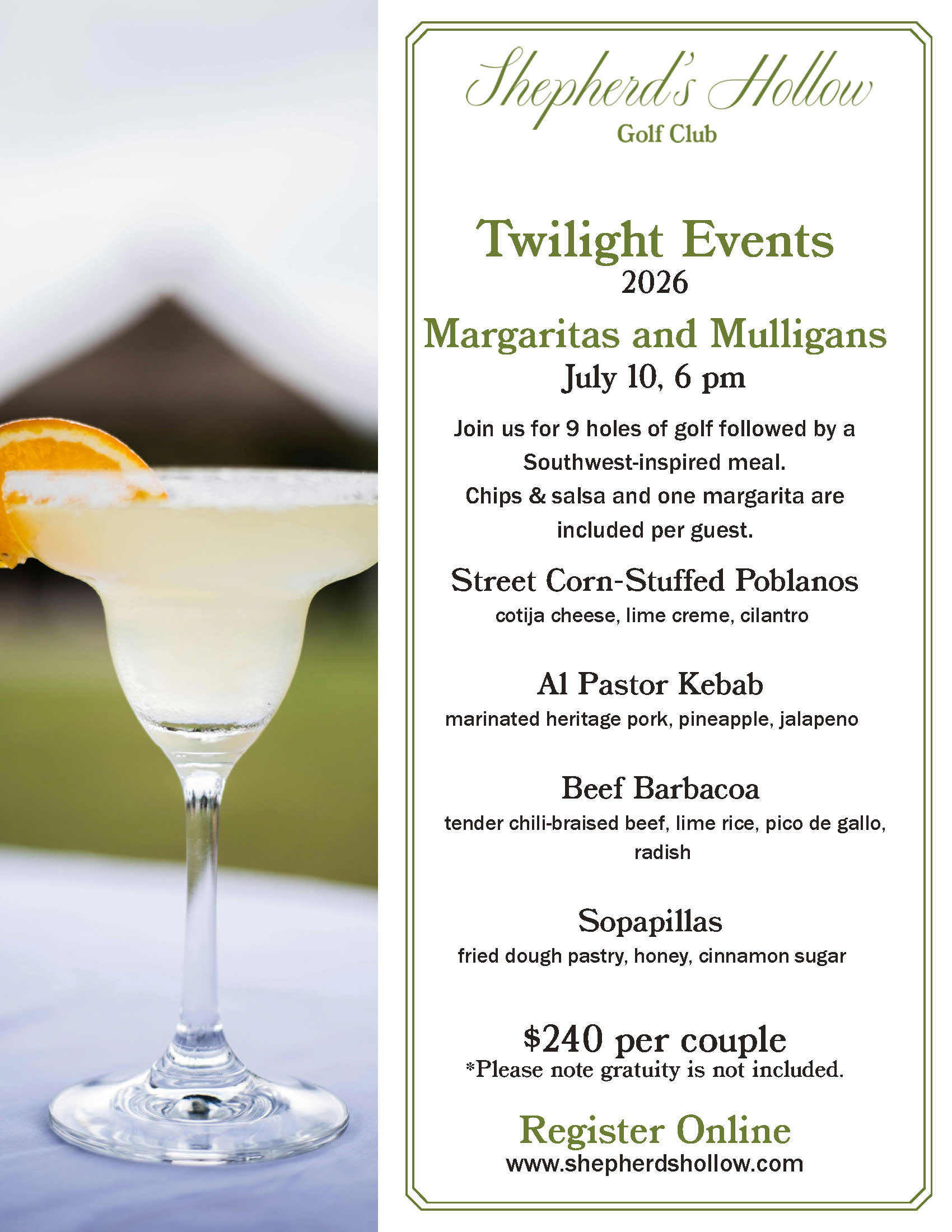 Join us for 9 holes of golf followed by a Southwest-inspired meal. Chips & salsa and one margarita are included per guest.